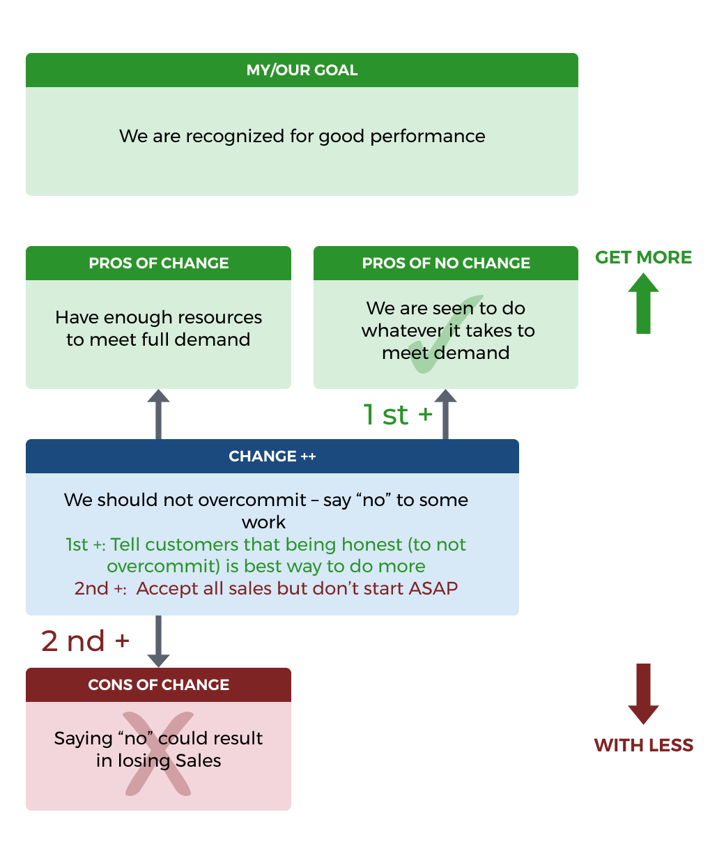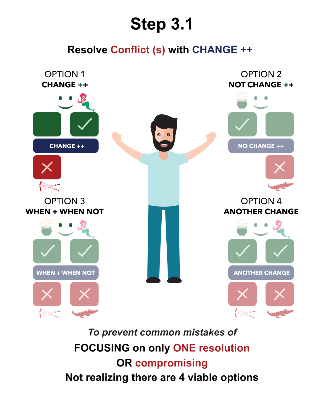 Step 3.1 – The Why…![]() Step 3.1 – The What…Step 3.1 is how to RESOLVE YOUR AND THEIR Decision with OPTION 1 called CHANGE ++. In this option, we treat the CHANGE as a half-baked solution and identify: