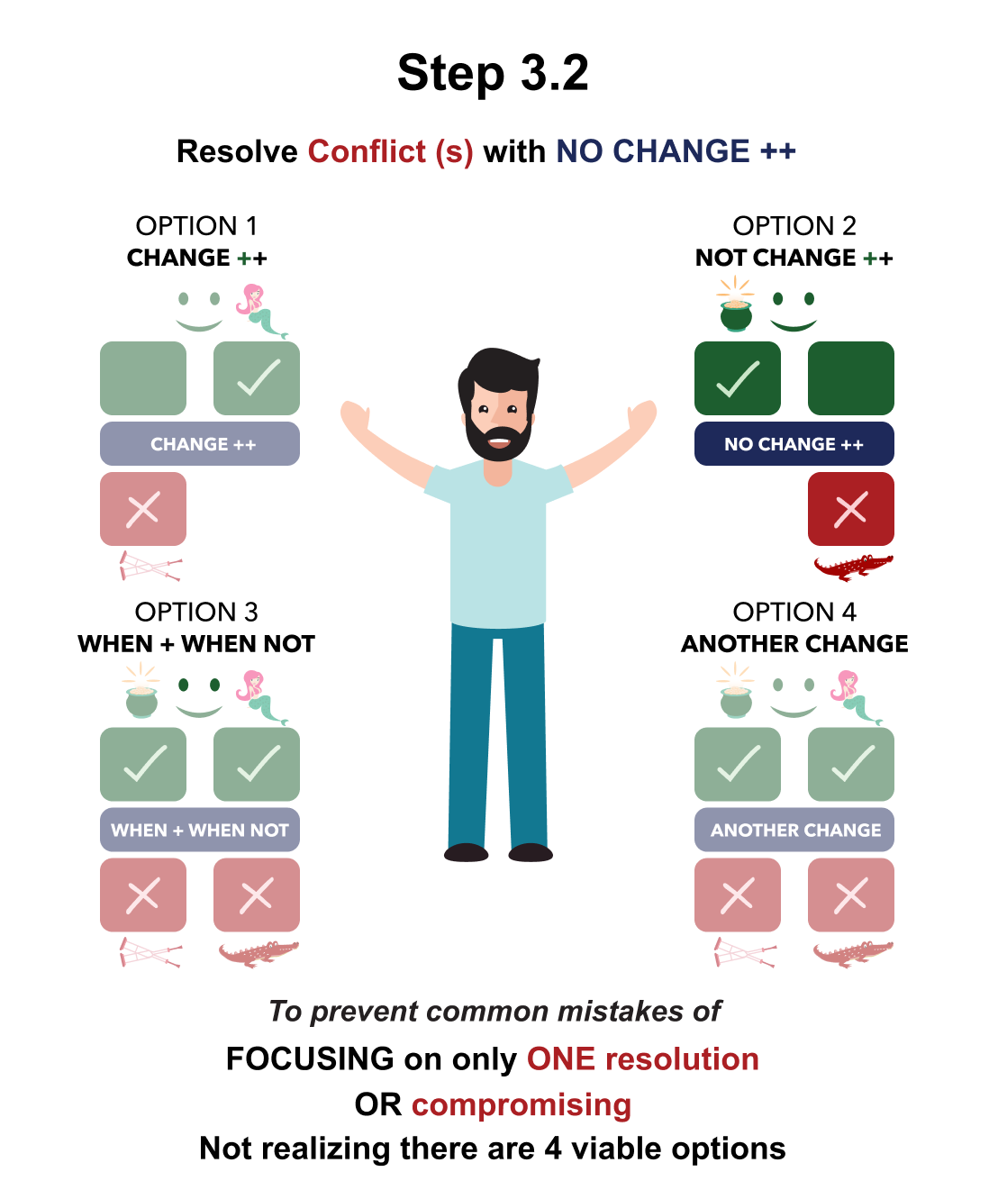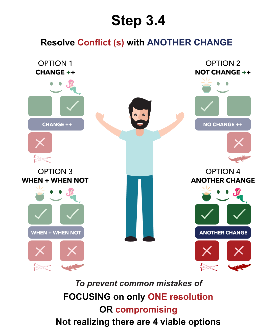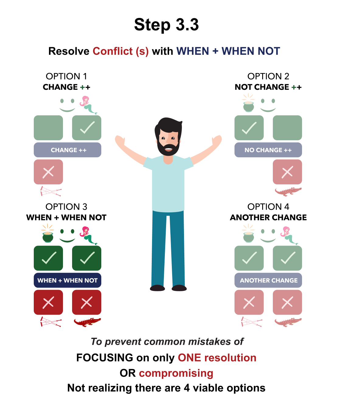 Step 3 is how to RESOLVE YOUR AND THEIR Decision with 4 different OPTIONS rather than compromising and giving up PROS you/them WANT to gain or keep and/or retaining CONS you/them DON’T WANT to gain or keep.